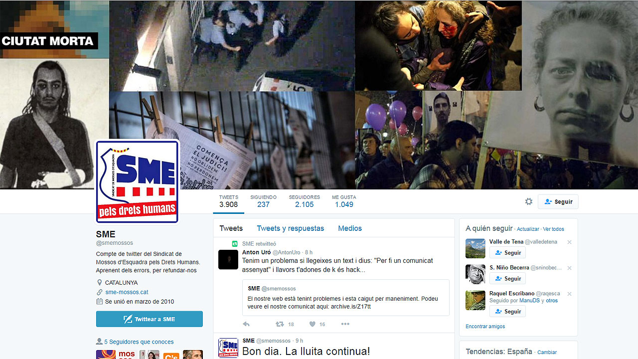 Piratas informáticos han atacado esta noche el perfil de Twitter del Sindicat de los Mossos d'Esquadra y han filtrado durante varias horas datos personales de unos 5.600 agentes afiliados al SME. Los "hackers" han colgado durante cerca de cuatro horas un enlace con datos personales de estos agentes de los Mossos, como sus nombres completos, domicilios, teléfonos e incluso cuentas bancarias. La imagen de la cuenta de Twitter del SME también ha sido modificada con imágenes de Ester Quintana, la mujer que perdió un ojo por el impacto de una bala de goma disparada por los Mossos, del documental "Ciutat Morta", donde se denunciaban abusos policiales en Barcelona, o de la detención que acabó con la vida de Juan Andrés Benitez.