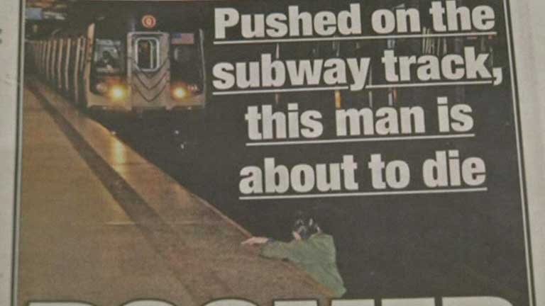 Sucedió el pasado lunes y el New York Post lo publicó en su portada de ayer. El metro a punto de arrollar a un hombre, que intenta subir...