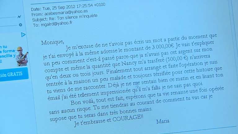 28/12/2012 00:01:40Asi le pedía ayuda a María Jesús una amiga suya que vive en París pero que estando de vacaciones en Costa de Marfil, le contaba que le habían robado todo. Le pidió mil euros que ella le ingresó en una cuenta. A los días le llegó otro correo y le avisaba de que allí, la tenían que operar de urgencia Lo que le pasó a María Jesús es una de las estafas más habituales por internet. Los delincuentes se hicieron con los contactos del correo de su amiga y suplantaron su identidad para conseguir miles de euros con un engaño que lleva títulos como este: mi vida depende de ti La policía recibe al año miles de denuncias de fraudes cibernéticos. Ofertas falsas de trabajo, con teléfono de contacto que derivan a otro de tarificacion especial es decir de los que nos cobran mucho. O este..El supuesto banco nos pide datos por bloqueo de la tarjeta de crédito