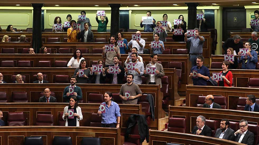 Los diputados de Unidos Podemos han protagonizado una protesta en el pleno del Congreso para pedir el cierre de los CIE (Centros de Internamiento...