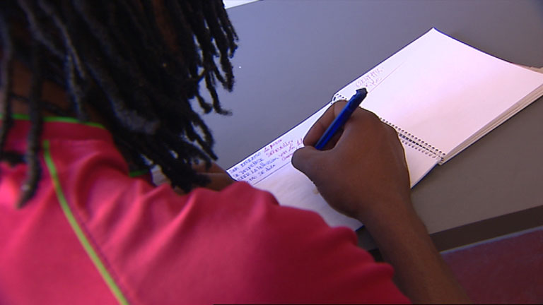 Ernest repasa lo que ha aprendido en sus clases de español. Es el primer paso para conseguir el sueño que en 2011 lo llevó a dejar a sus tres hijos...