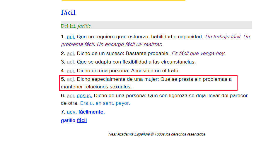 La Real Academia Española (RAE) no "censurará" en el diccionario la acepción de "fácil" para referirse "especialmente" a la mujer que se presta sin problemas a mantener relaciones sexuales aunque "siempre es revisable" y el futuro podría incluir una marca explicativa al igual que ha ocurrido con otras expresiones como "sexo débil" en la reciente en la reciente actualización del diccionario digital. Ante la polémica surgida en las redes sociales, la RAE recuerdan que los diccionarios lo que hacen es documentar el uso que se hace del idioma y en ese sentido es una obra descriptiva.