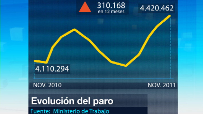 El paro aumentó en noviembre en casi sesenta mil personas, el doble que en el mismo mes del año pasado y donde más se ha notado es en los servicios y la hostelería. El desempleo registrado sube por cuarto mes consecutivo, se acerca ya a los cuatro millones y medio de personas y marca un nuevo récord. La mayor parte de los casi sesenta mil nuevos parados, más del ochenta por ciento, procede del sector servicios. El gobierno afirma que ha hecho todo lo que ha podido para frenar el desempleo. Y ha reconocido que hay dudas sobre si la Seguridad Social acabará 2011 con superávit. Los sindicatos piden que todos los recursos se pongan a disposición de la creación de empleo. Los distintos partidos políticos coinciden en mostrar su preocupación por estos datos. Para el PP, las cifras del paro animarán al nuevo gobierno a trabajar para combatirlas. Angela Merkel ha expuesto ante el parlamento alemán las ideas que defenderá en el próximo Consejo Europeo para refundar el euro. Un discurso sin grandes novedades en el que ha insistido en que hay que reformar los tratados y poner en práctica la unión fiscal...
