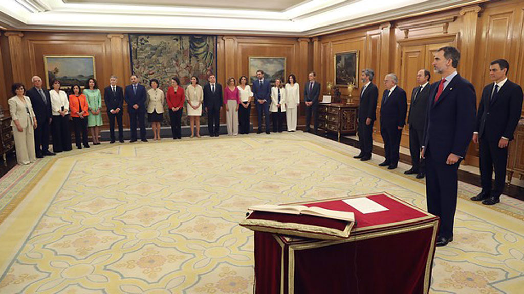 Los diecisiete miembros del Gobierno de Pedro Sánchez, once ministras y seis ministros, han prometido sus cargos, ante el Rey en el Palacio de La...