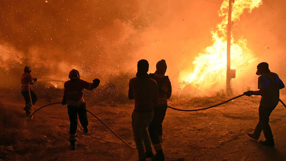 Desesperados ante el avance de las llamas, los vecinos de Arbo, en Pontevedra, luchan como pueden, con sus propios medios contra el fuego que está...