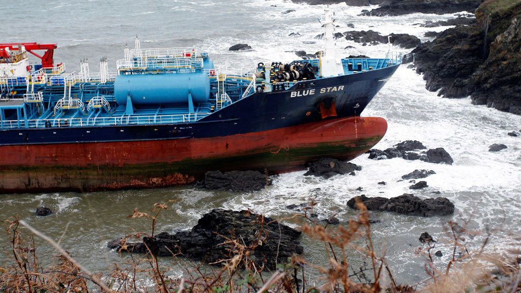 Complicada operación de rescate del petrolero Blue Star, que encalló en Ares, en la costa coruñesa, arrastrado por el temporal tras un incendio en...