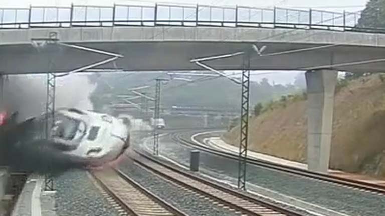 Es el momento del accidente, el instante grabado por una cámara de seguridad de las vías, en el que a las 20,40 de la noche descarrila el tren...