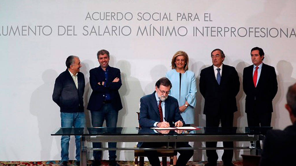 26/12/2017 00:02:48El presidente del Gobierno, los sindicatos y la patronal han firmado el acuerdo para subir el Salario Mínimo Interprofesional hasta los 736 euros...