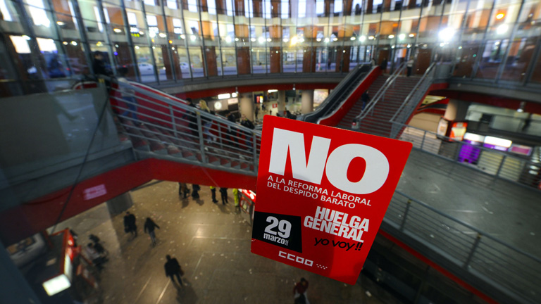 29/03/2012 00:03:54España vive la huelga general de 24 horas de la democracia y es la primera para el Gobierno de Mariano Rajoy. La protesta contra la reforma laboral se ha notado sobre todo en la industria, los servicios de limpieza y la construcción. Es menor el seguimiento en la administración pública. En los transportes había pacto de mínimos con el ministerio y se están cumpliendo y por ejemplo en el metro de Madrid circulan más trenes de los acordados. En la enseñanza la huelga se ha notado mucho más en el sector público que en el privado. En los ambulatorios se han respetado las citas y en los hospitales los servicios mínimos garantizan la atención en urgencias. El seguimiento es desigual en el comercio y la hostelería, los sectores dónde parece que menos incidencia está teniendo el paro. El aumento de la presencia policial se ha notado especialmente a primera hora. -- Tanto los sindicatos como el Gobierno coinciden en la normalidad de la jornada de huelga y en que se están cumpliendo los servicios mínimos. Los líderes de UGT y CCOO se han mostrado satisfechos con la respuesta de los trabajadores, hablan de de un seguimiento del 77%. -- Los datos sobre la huelga los ha facilitado, por primera vez, el ministerio del interior y hace poco más de una hora la ministra Fátima Báñez ha hablado en el congreso y ha destacado que la normalidad y el cumplimiento de los servicios mínimos. La ministra de empleo dice que el Gobierno está abierto al diálogo pero que la base de la reforma laboral no se va a modificar. -- Los candidatos de Foro y del PP, Francisco Álvarez-Cascos y Mercedes Fernández, se reúnen para hablar de posibles pactos de gobierno. Álvarez-Cascos ha ofrecido al PP un acuerdo abierto a todas las posibilidades, que no excluye ceder la presidencia a los populares. Mercedes Fernández asegura que el objetivo es que Asturias tenga un gobierno estable. -- Fin de la gira del Papa por México y Cuba. En su despedida en La Habana, ha vuelto a defender las libertades fundamentales y la reconciliación entre cubanos. Benedicto XVI ha estado tres días en la isla, donde, entre otros actos, se ha entrevistado durante media hora con el expresidente Fidel Castro. -- El Barça empató a cero con el Milán en la ida de cuartos de final de la Champions. Los azulgranas reclamaron dos penaltis y se quejaron del mal estado del césped de San Siro. El próximo martes, en directo en La 1 de TVE, el partido de vuelta.