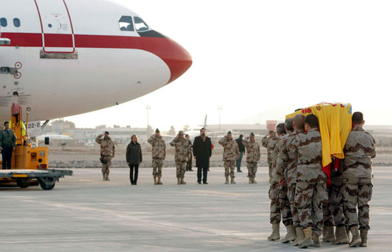 A las doce de la noche llegará a la zona militar del aeropuerto de Barcelona el cuerpo de John Felipe Romero, el soldado español muerto en un atentado en Afganistán. En el mismo avión viajan tres de los militares heridos. Esta mañana, en Herat, sus compañeros lo han despedido en un acto presidido por la ministra Carme Chacón.