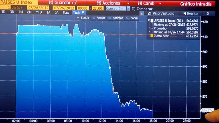 26/07/2012 00:05:03Hoy ha sido un día de buenas noticias en los mercados. La prima de riesgo ha caído 50 puntos, hasta los 561. Es la primera vez en una semana que cierra por debajo de los 600 puntos básicos. Y la bolsa se anotaba una subida del 6 por ciento, la mayor en más de dos años. Todo esto después de que el presidente del Banco Central Europeo Mario Draghi haya dicho que hará todo lo necesario para preservar el euro. El ministro de Economía ha dicho esta tarde que contaba con ello y que no le sorprenden esas palabras. -- La comisión de Economía del Congreso han seguido las comparecencias sobre la crisis bancaria. Había mucha expectación por escuchar al ex presidente de Bankia, Rodrigo Rato. -- El presidente del gobierno ha recibido hoy por primera vez a los secretarios generales de UGT y CCOO. Encuentro de dos horas en la Moncloa con Méndez y Toxo para analizar la crisis económica, tras una reciente reunión de los líderes sindicales con la canciller Merkel. Méndez y Toxo han pedido a Rajoy un referéndum sobre las medidas de ajuste. -- La guardia civil recupera cerca del río Guadiana, a su paso por Badajoz, parte del arsenal robado hace más de un año en la base militar de la provincia. Son cuatro pistolas y 14 fusiles de asalto. La búsqueda del armamento empezó en junio tras la detención de 11 personas. -- Se cumplen 60 años de la muerte de Eva Perón. Cientos de personas la recuerdan hoy en el panteón donde descansan sus restos. -- Primer día de competición para España en los Juegos Olímpicos de Londres y no le ha ido muy bien a la selección de fútbol.