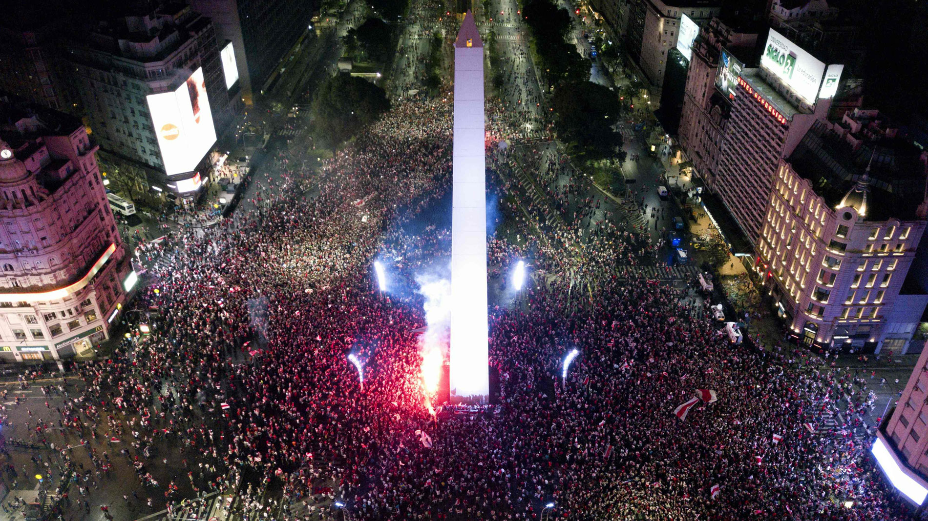 Así han celebrado los hinchas del River, en Buenos Aires, que son los nuevos campeones de América... Campeones de la Copa Libertadores. Entre 40.000 y 50.000 aficionados han rodeado el Obelisco, a pocos metros del Estadio Monumental, el campo del River... Una marea de aficionados con camisetas y banderas rojiblancas.