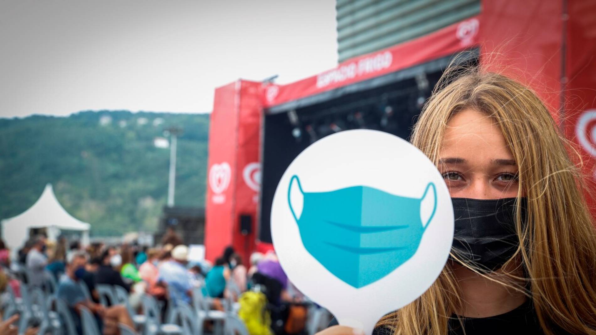 Foto: Una trabajadora del Festival de Jazz de San Sebastián, que abre este miércoles su 56 edición, recuerda a los asistentes las las precauciones necesarias a causa de la COVID. EFE/Javier Etxezarreta