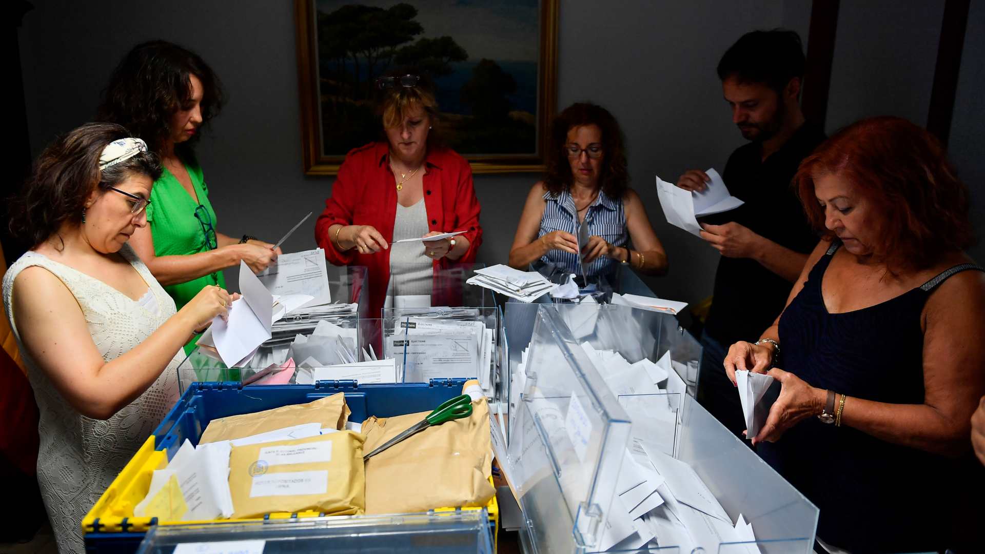 Foto: Trabajadoras de la junta electoral y representantes de partidos políticos en el recuento de votos emitidos por los residentes en el extranjero en Palma de Mallorca. EFE/ Miquel A. Borràs
