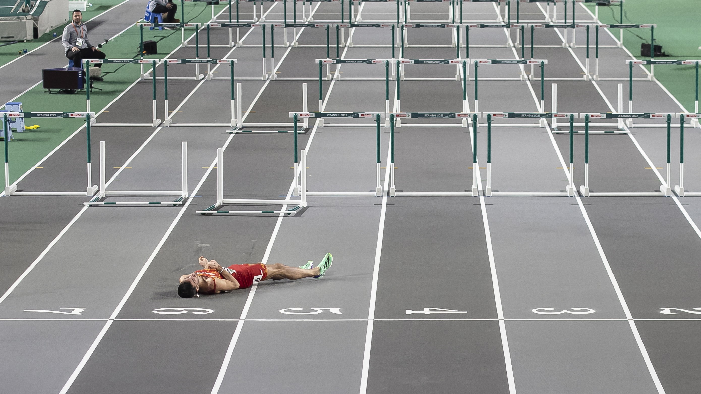 Quique Llopis, que permaneció tendido en el suelo durante unos minutos, en la final de los 60 m vallas se recupera de su aparatosa caída. Así se...