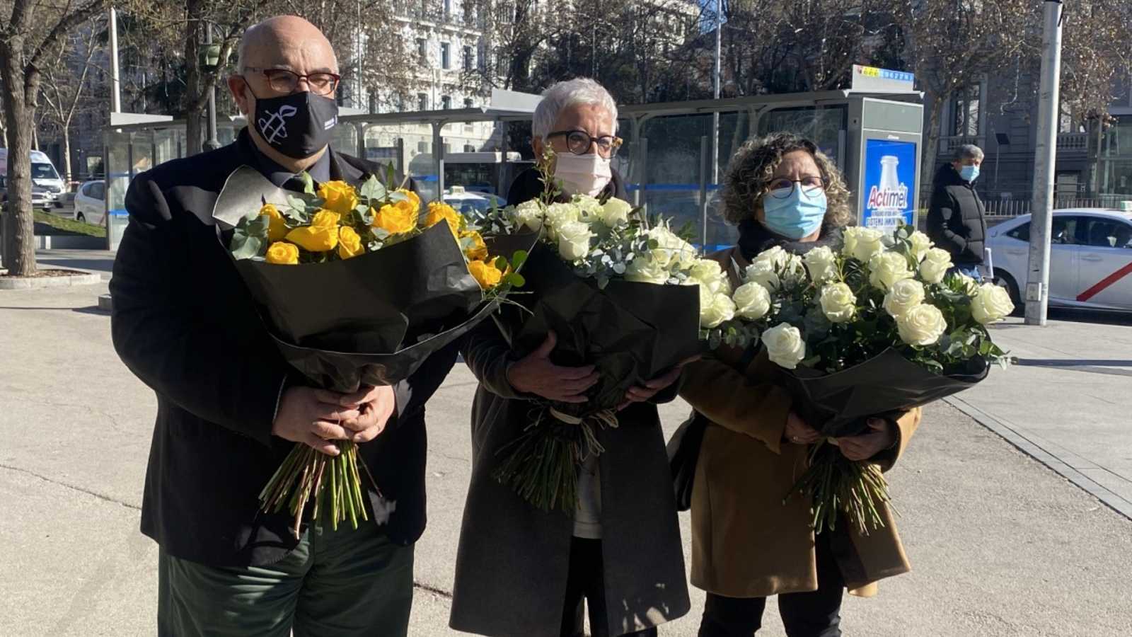 Foto: Ángela (c) y Enriqueta (d), cuyas madres fallecieron en una residencia durante la primera ola, junto al director de Amnistía Internacional. RTVE.ES