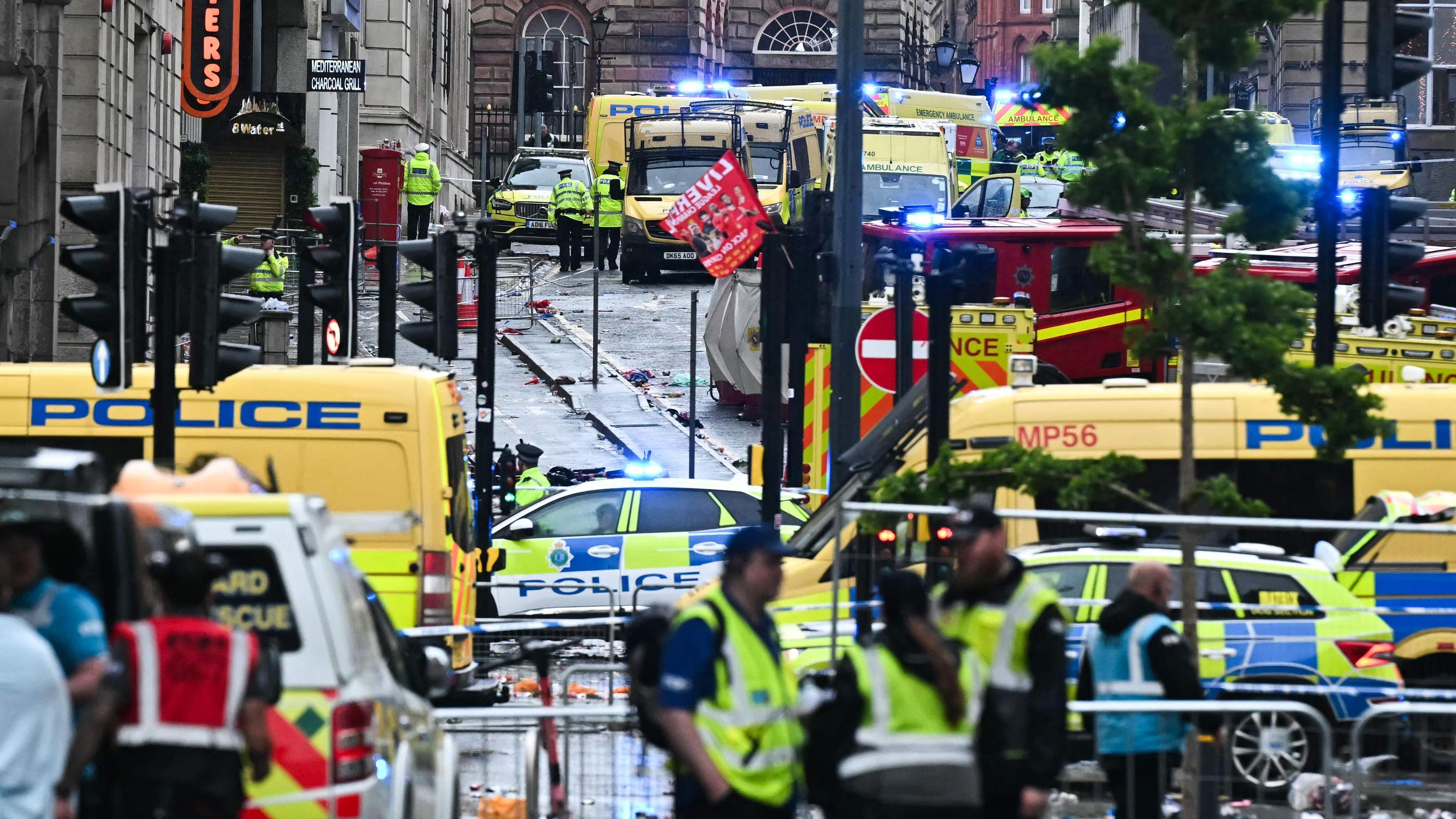 Es el momento en que un coche se lleva por delante a varias personas en el centro de Liverpool, en Inglaterra, donde celebraban la victoria de su...