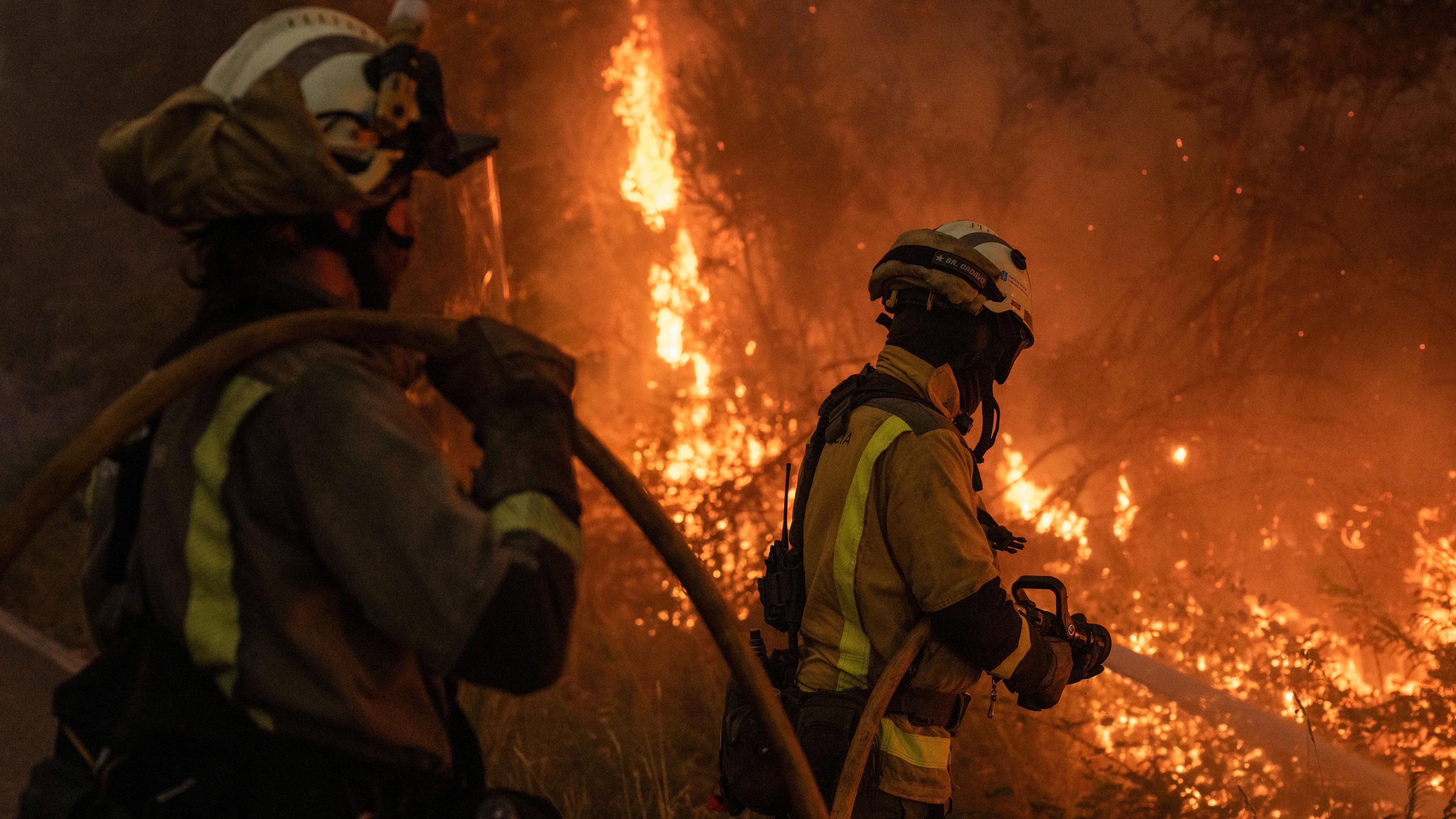Los equipos de extinción trabajan sin descanso con apoyo de la Unidad Militar de Emergencias en dos frentes para controlar el incendio de As Neves, en...