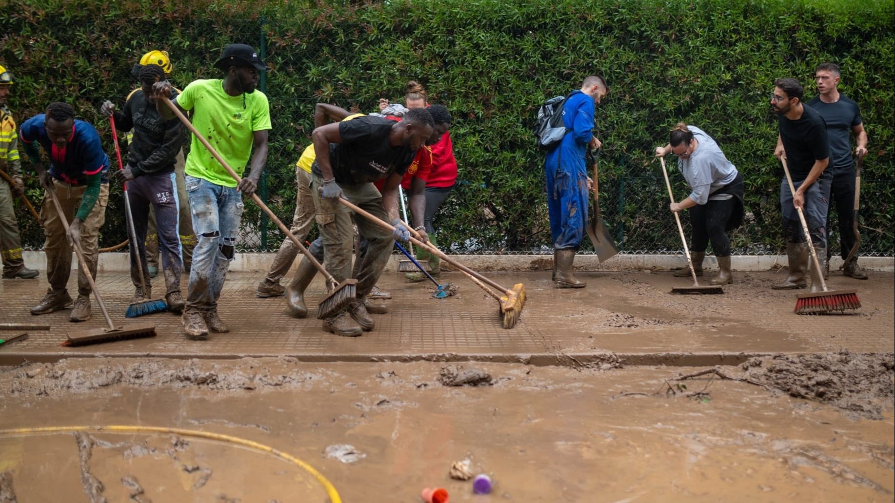 Foto: LORENA SOPENA/EUROPA PRESS — Vecinos de La Ràpita limpian el barro de una de las calles afectadas por el temporal.