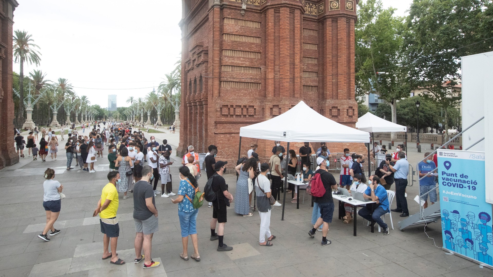 Foto: Numerosas personas esperan para vacunarse en un punto móvil instalado en Arco de Triunfo, en Barcelona (EFE/Marta Pérez)