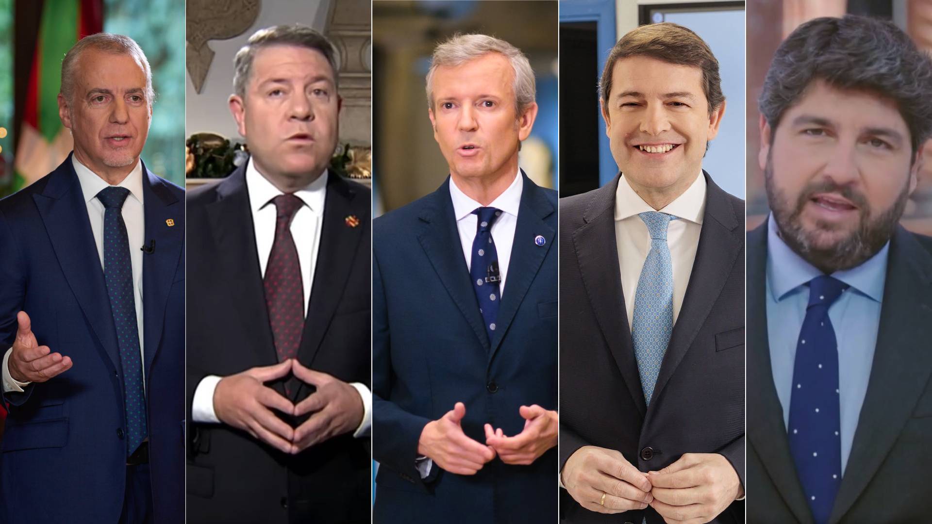 31/12/2023 00:00:59En su tradicional mensaje con motivo del fin de año, algunos presidentes autonómicos repiten, otros se estrenan, como la presidenta de las Islas Baleares, Marga Prohens, del PP, y otros se despiden como es el caso del lehendakari, Íñigo Urkullu, que lo ha hecho con un discurso en clave territorial en el que ha advertido que el "autogobierno" en el País Vasco, "ni está garantizado ni ha tocado techo". Todos han aprovechado para dedicar unas palabras a la situación de la política nacional, y el más contundente ha sido el presidente de Castilla-La Mancha que ha defendido la Constitución y ha pedido "igualdad" y "unidad". Un mensaje que también ha llegado por parte de los presidentes del PP, como el de la Xunta, Alfonso Rueda, que ha hablado de "riescos que amenazan a un marco constitucional", mientras que el de Castilla y León, Alfonso Fernández Mañueco, ha advertido que "sin Constitución no hay democracia". Los presidentes del PP también han apelado a la igualdad, como el de Murcia, Fernando López Miras, que ha asegurado que no va a "tolerar" que se "quiebre la igualdad entre territorios". Todos acaban su intervención deseando un feliz 2024. Foto: Efe/Europa Press.