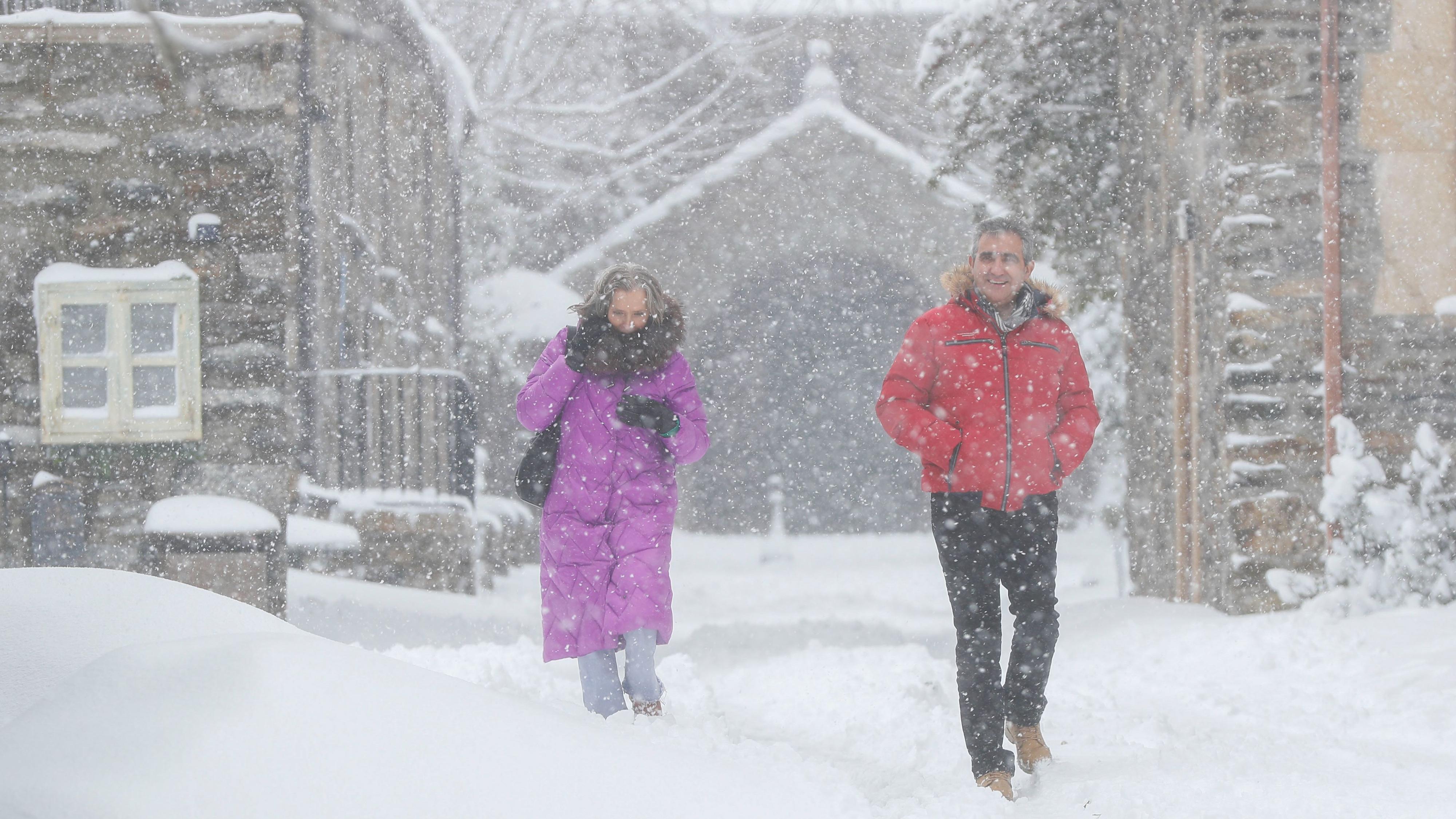 Foto: Eliseo Trigo/EFE — Personas caminan en el municipio lucense de Pedrafita do Cebreiro durante una fuerte nevada