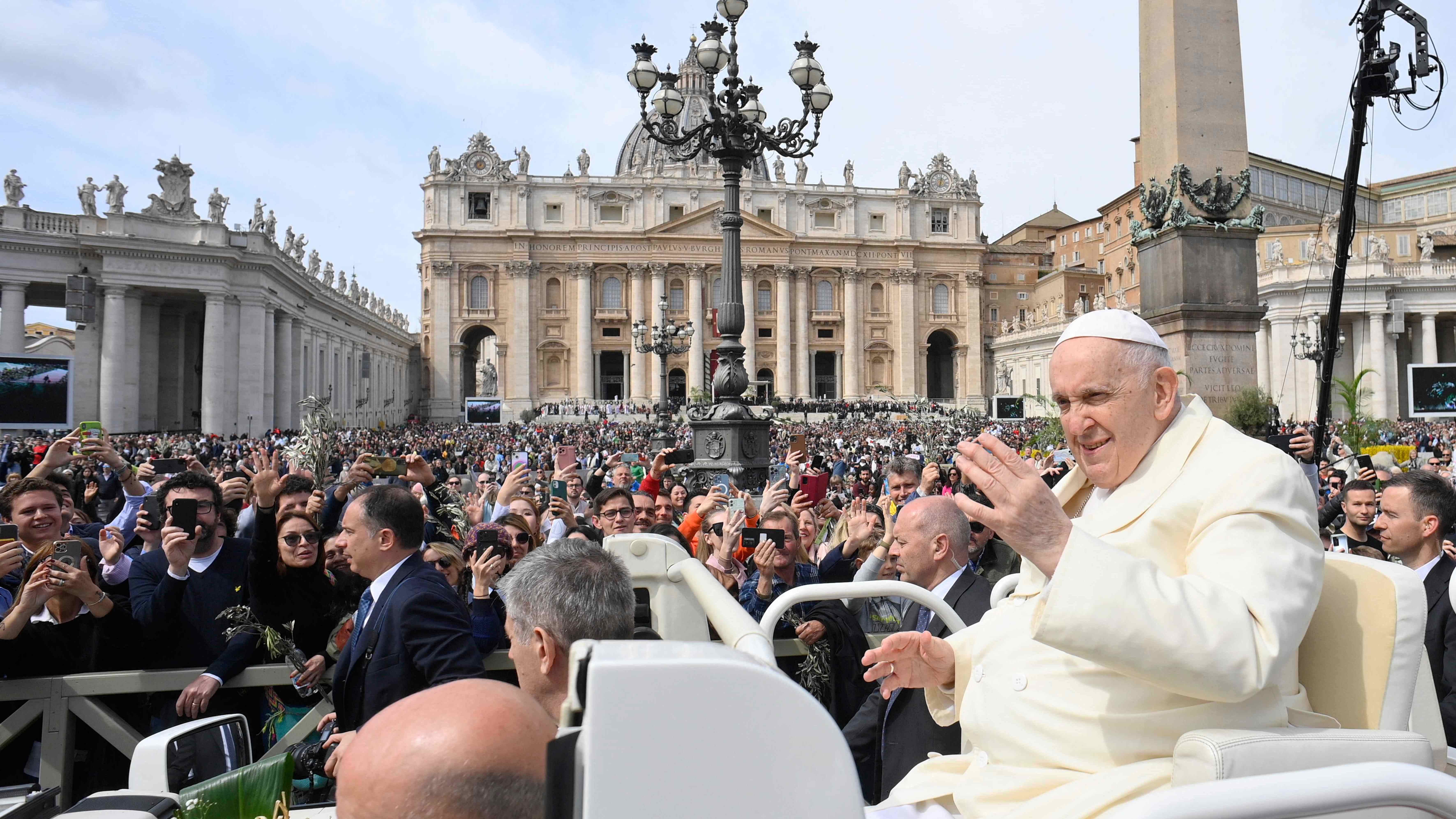 El papa Francisco ha reaparecido en la plaza de San Pedro del Vaticano para presidir la misa del Domingo de Ramos, un día después de recibir el alta hospitalaria por la bronquitis que lo mantuvo ingresado desde el pasado miércoles. Francisco fue llevado sentado sobre un vehículo descapotable, el "papamóvil", hasta el centro de la plaza, a los pies del obelisco, para bendecir los ramos de los fieles y miembros de la Curia Romana que habían procesionado por el lugar unos instantes antes.