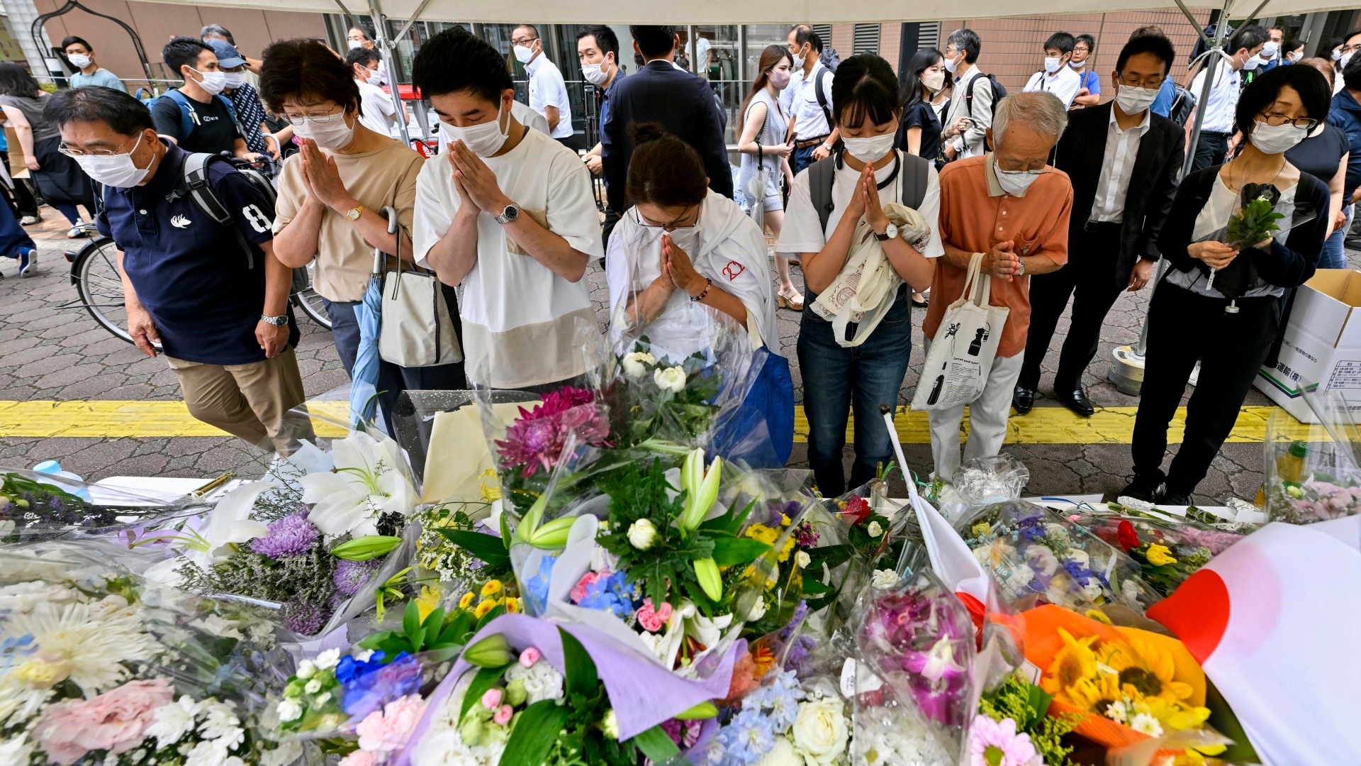Foto: Ciudadanos japoneses rezan frente al memorial en nombre del ex primer ministro Shinzo Abe. Kyodo News/ AP