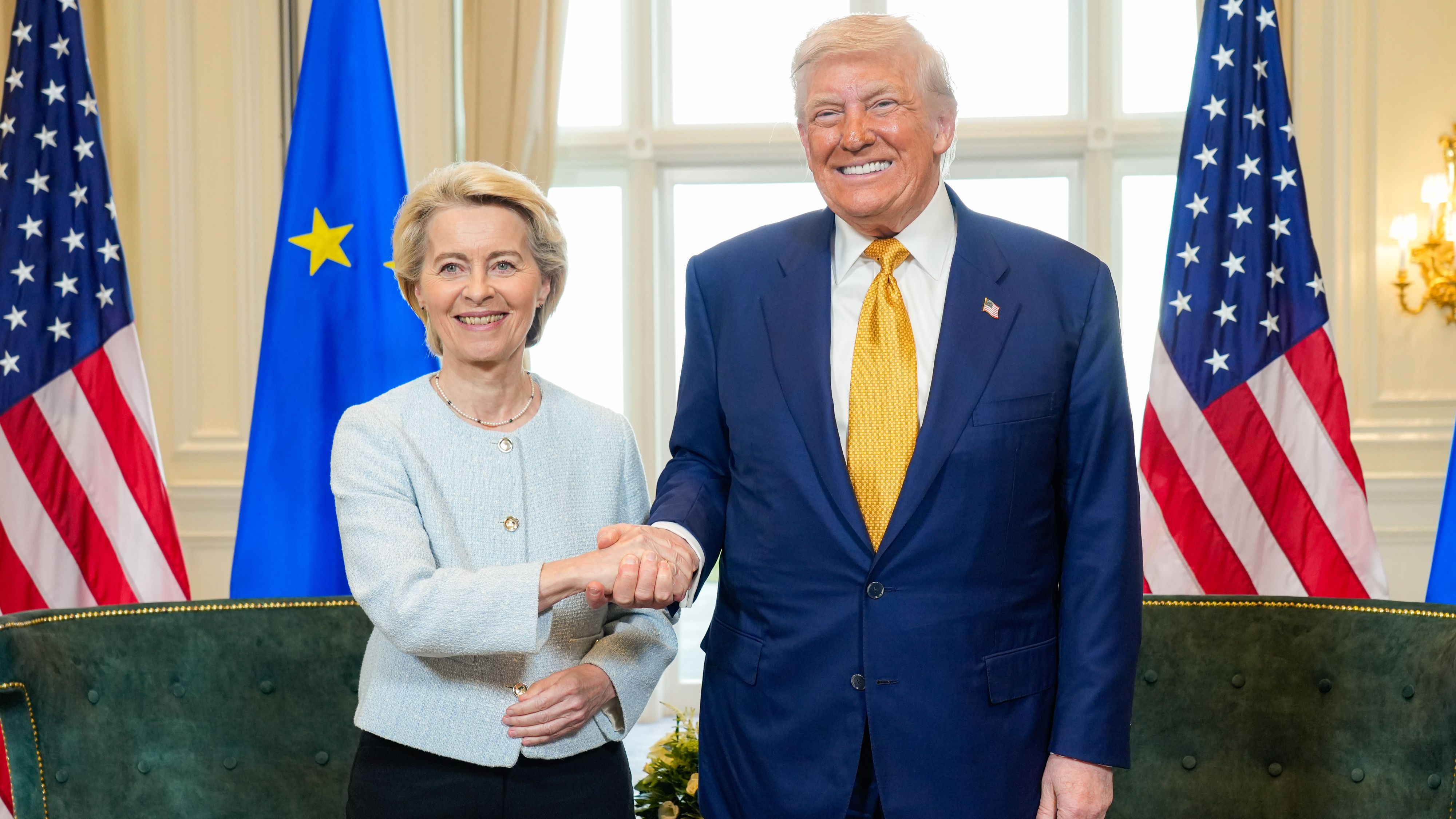 28/07/2025 00:03:15El presidente de Estados Unidos, Donald Trump, y la presidenta de la Comisión Europea, Ursula von der Leyen, han sellado un acuerdo comercial este domingo en Turnberry, al suroeste Escocia, en el cual han fijado aranceles del 15% a las exportaciones del bloque comunitario. En virtud de este pacto, la UE acepta comprar energía de su país por valor de 750.000 millones de dólares e invertir 600.000 millones de dólares más en el país, además de aumentar sus adquisiciones de equipamiento militar estadounidense.
