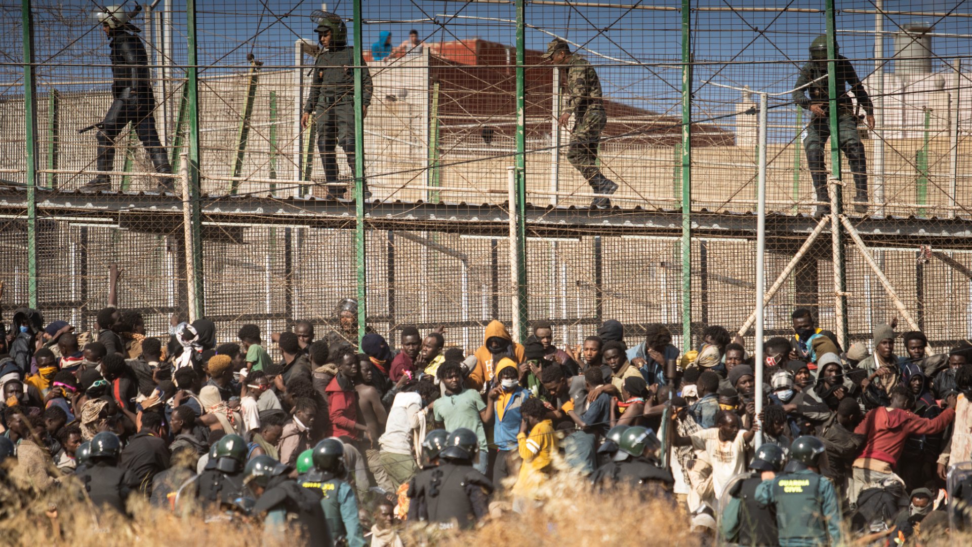 Foto: Decenas de migrantes tratan de cruzar la frontera por la valla de Melilla ante las Fuerzas y Cuerpos de Seguridad de Marruecos y España. AP Photo/Javier Bernardo.