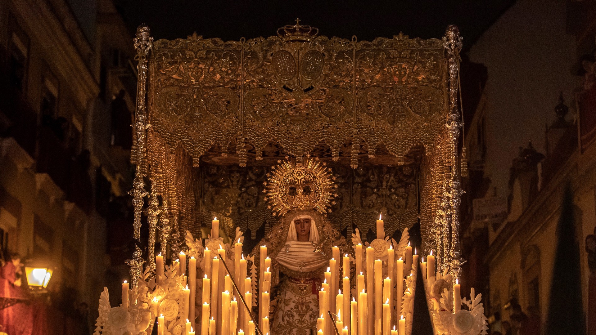 FOTO: El paso de la Virgen de Nuestra Señora de la Esperanza en el barrio de Triana durante la Madrugá de Sevilla. EFE/ Julio Munoz