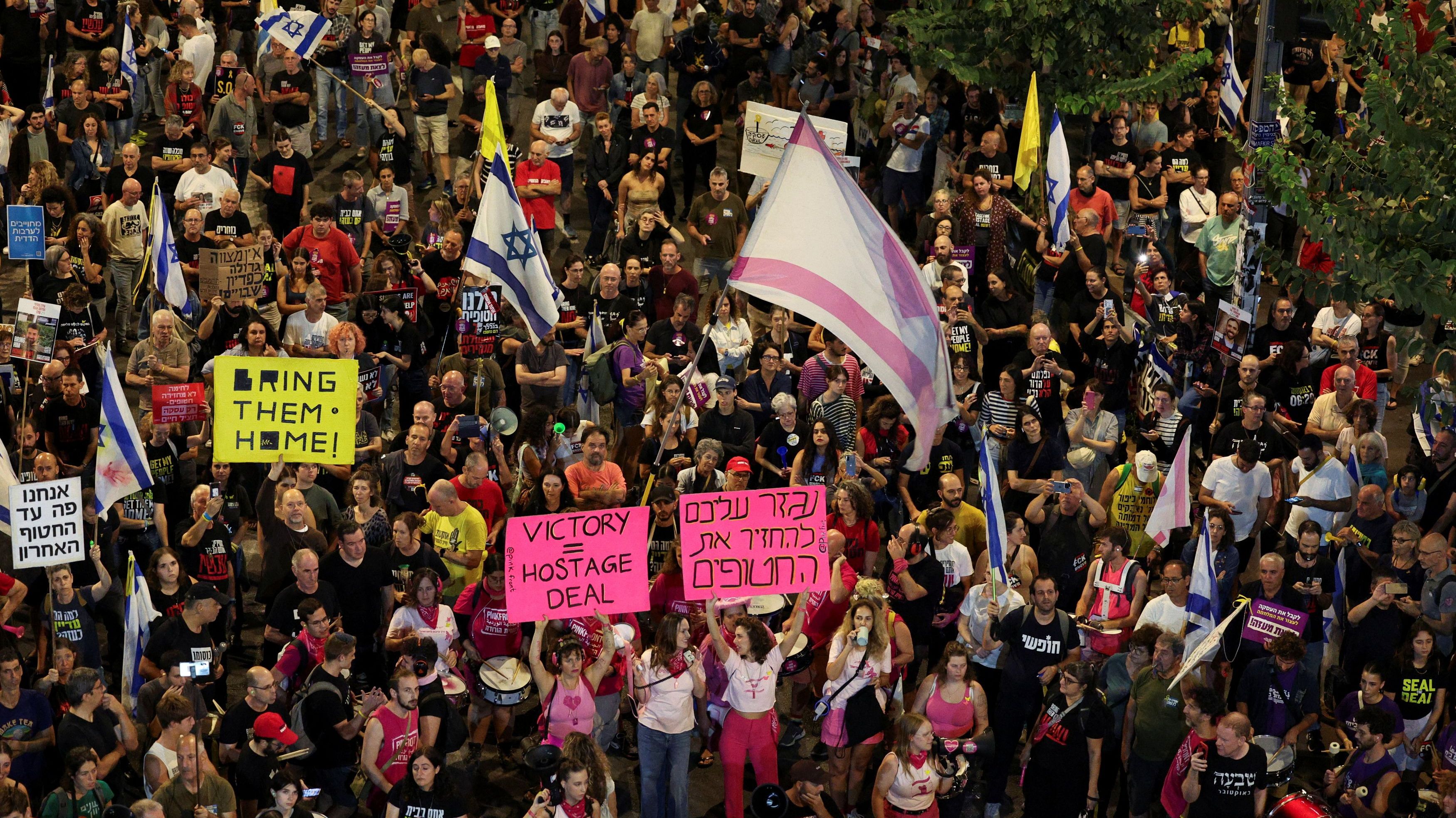 20/10/2024 00:04:03La muerte del líder de Hamás Yahya Sinwar ha reavivado las protestas contra Benjamín Netanyahu de los sábados en Tel Aviv. Miles de personas han exigido al primer ministro aprovechar la muerte del ideólogo de los ataques del 7 de octubre de 2023 para llegar a un acuerdo con Hamás que permita un alto el fuego y el regreso a casa de los rehenes aún en manos de la milicia.