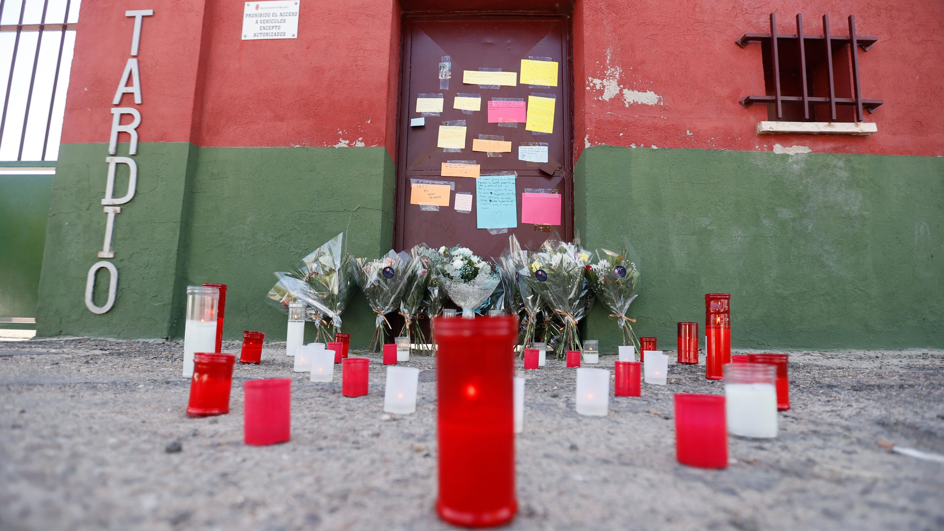 FOTO: Velas y flores en homenaje ante el polideportivo Ángel Tardío en Mocejón (Taledo). EFE/ Ismael Herrero