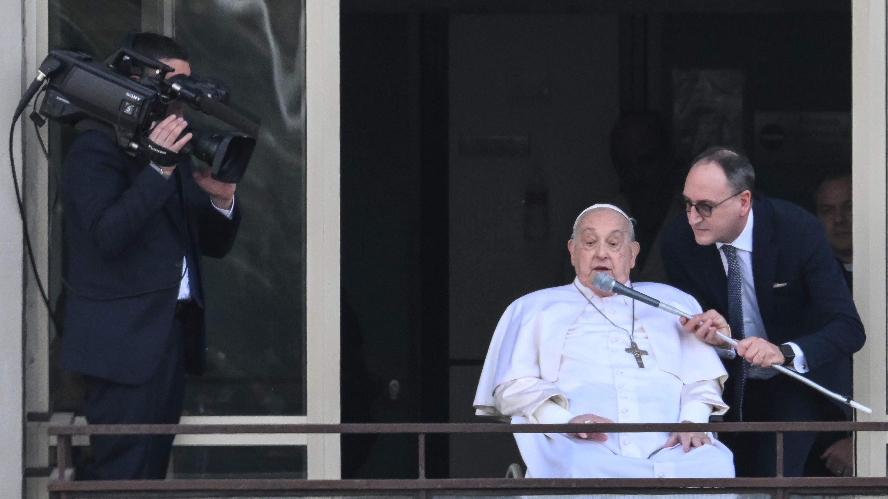 24/03/2025 00:02:19El papa Francisco ha reaparecido este domingo en público tras pasar 38 días ingresado por culpa de una bronquitis persistente que derivó en una neumonía bilateral. El pontífice se ha asomado en silla de ruedas por un balcón del Hospital Agostino Gemelli de Roma a la hora del Ángelus (12:00 horas) para saludar e impartir la bendición a decenas de fieles que han acudido: "Gracias a todos, veo a esa señora con el ramo de flores amarillo", ha dicho con una voz débil, consecuencia del duro cuadro clínico que ha sufrido.