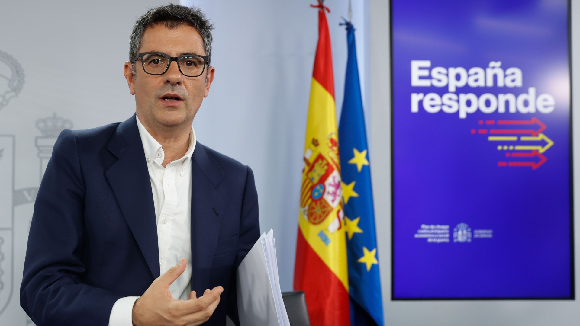 FOTO: El ministro de Presidencia, Félix Bolaños, tras su comparecencia este lunes en Madrid para informar del nuevo paquete de medidas urgentes para la eficiencia y el ahorro energético. EFE/Mariscal