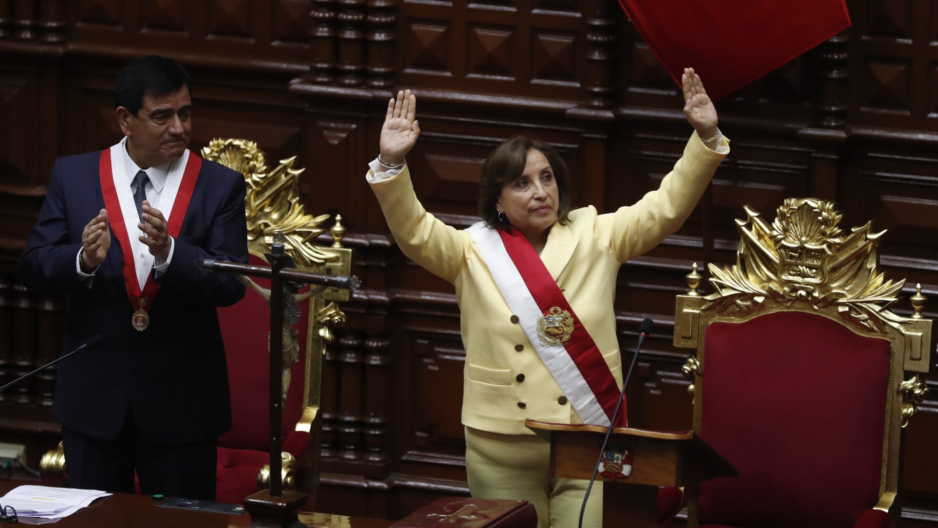 Foto: La abogada Dina Boluarte saluda tras jurar el cargo como nueva presidenta del Perú ante el presidente del Congreso, José Daniel Williams Zapata (i),en la sede del Congreso en Lima (Perú).  EFE/ Paolo Aguilar