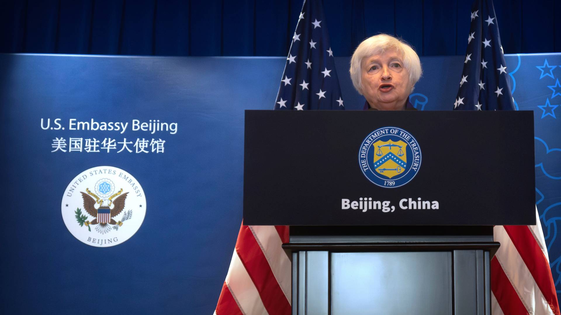 Foto: La secretaria del Tesoro de Estados Unidos, Janet Yellen durante una rueda de prensa en la embajada de Estados Unidos en Pekín. AP Photo/Mark Schiefelbein.