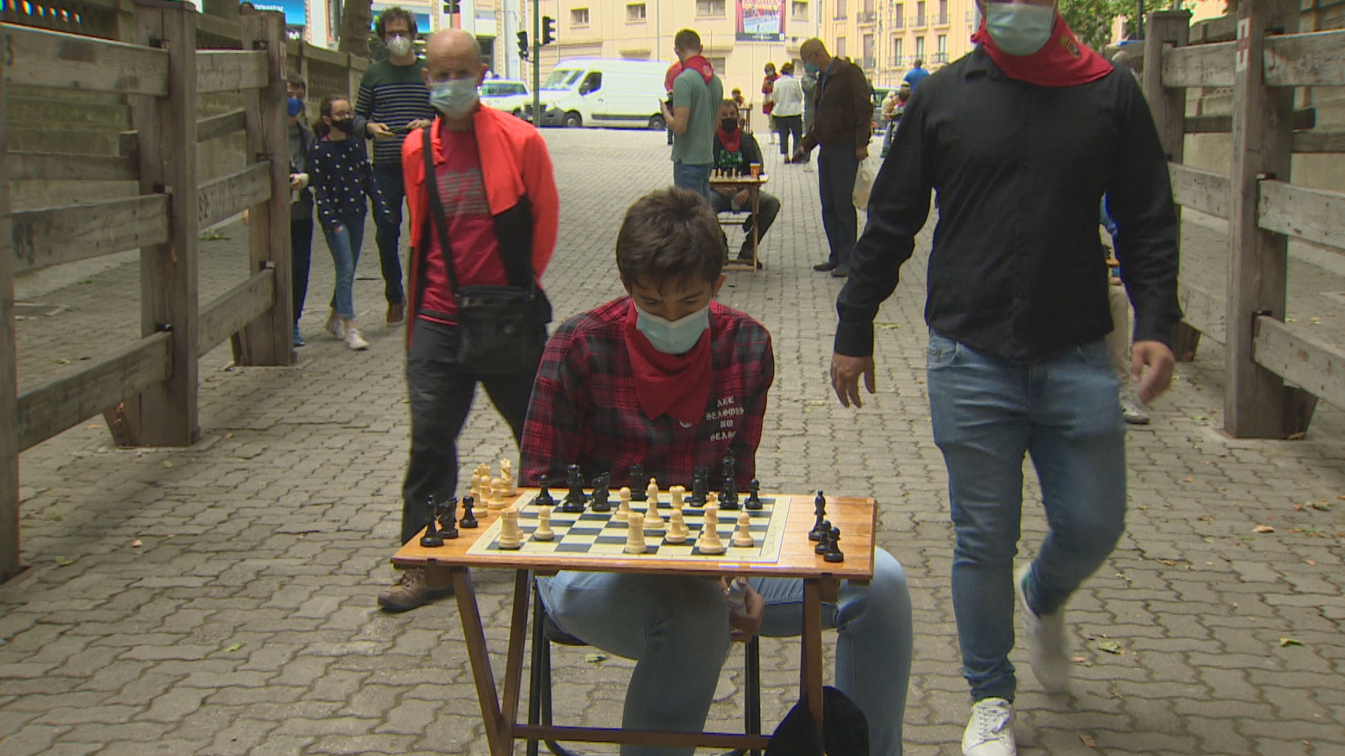 80 mesas de ajedrez sustituyen a los toros en el que sería el último encierro de los Sanfermines 2021. Seis maestros juegan partidas simultáneas a...