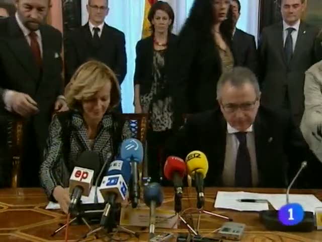 La ministra Elena Salgado y el presidente del gobierno de Navarra, Miuel Sanz firman en Madrid la actualización del convenio económico entre Navarra...