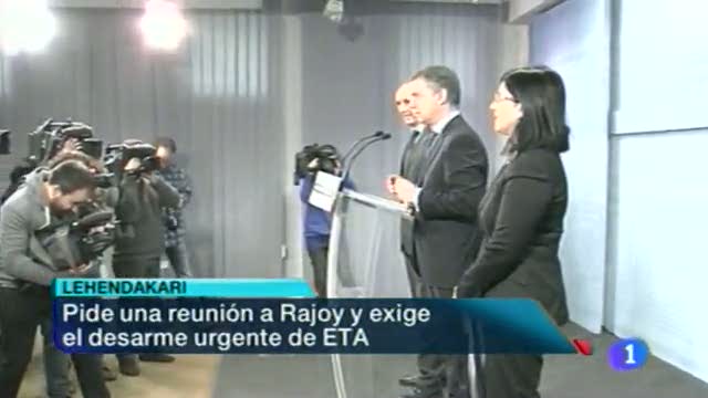 30/12/2013 00:26:30El lehendakari ha dicho que el desarme de ETA es urgente para conseguir la paz en Euskadi. Iñigo Urkullu ha pedido una reunión a Mariano Rajoy para abordar entre otras cuestiones la situación de los presos de la banda terrorista tras su comunicado del sábado.// Nueva movilización esta mañana en Bilbao de los socios y trabajadores de Edesa. Siguen teniendo esperanzas de que su factoría pueda eludir el cierre definitivo tras el discreto anuncio que han recibido de Mondragón Corporación, por el que les comunicaba la existencia de un plan de viabilidad.// Real y Athletic preparan el derbi que les enfrentará el domingo en Anoeta pendientes de la enfermería. Los donostiarras recuperan a Mikel Gonzalez y Estrada y mantienen las dudas de Zurutuza y De la Bella.(30/12/13)