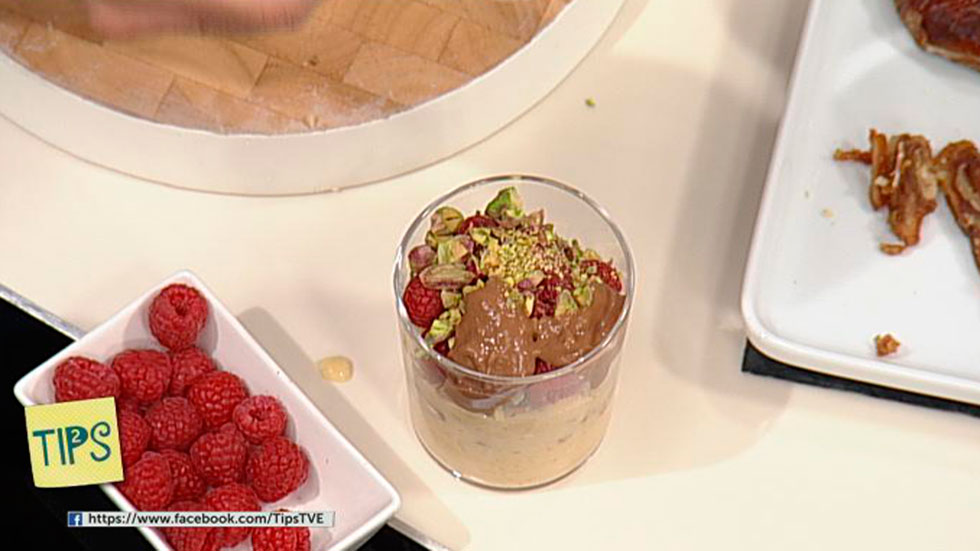 Triffle de plátano y dátil con salsa de chocolate especiado