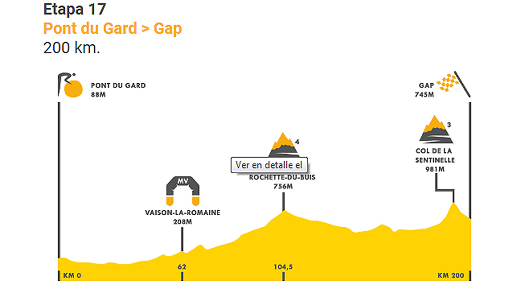 La decimoséptima etapa del Tour llevará al pelotón de Pont du Gard hasta Gap tras recorrer 200 kilómetros con dos puertos puntuables de cuarta y...