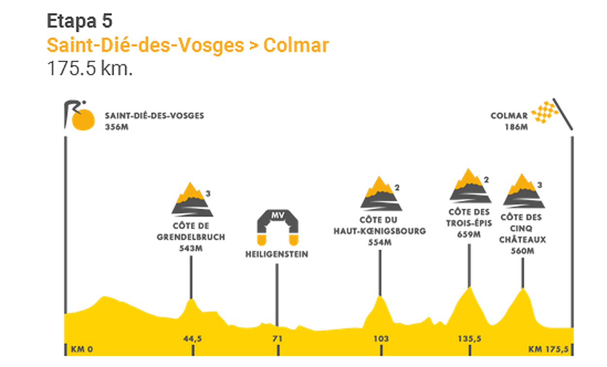 Los ciclistas cubrirán los 175,5 kilómetros entre Saint-Dié-des-Vosges y Colmar con cuatro dificultades montañosas, dos de tercera y dos de segunda...