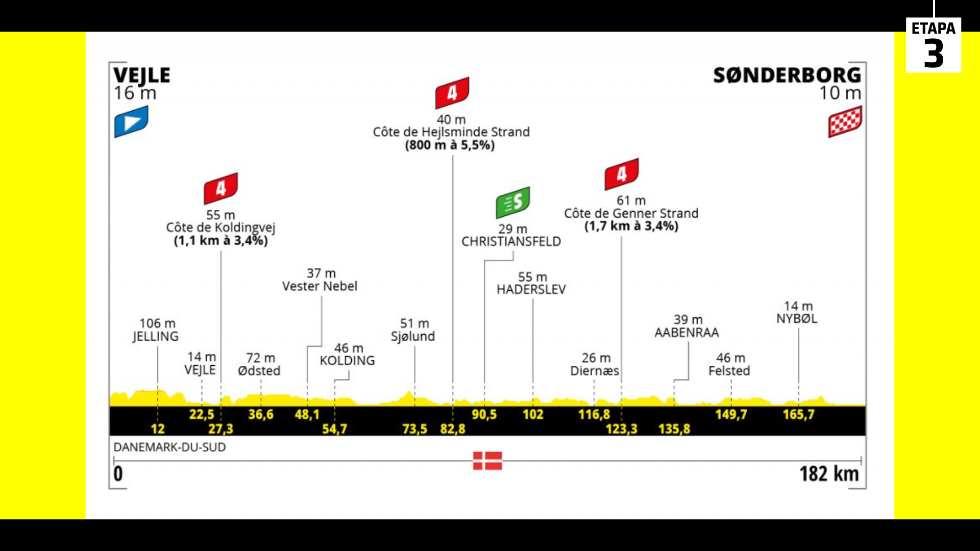 El perfil de la tercera etapa del Tour de Francia 2022, de 182 kilómetros entra las localidades de Vejle y Sondeborg, todavía discurre por...