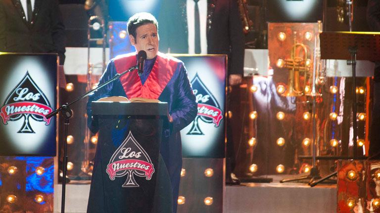 Carlos Latre muestra su apoyo a Los Nuestros cantando un fragmento de las sagradas escrituras de la orquesta.