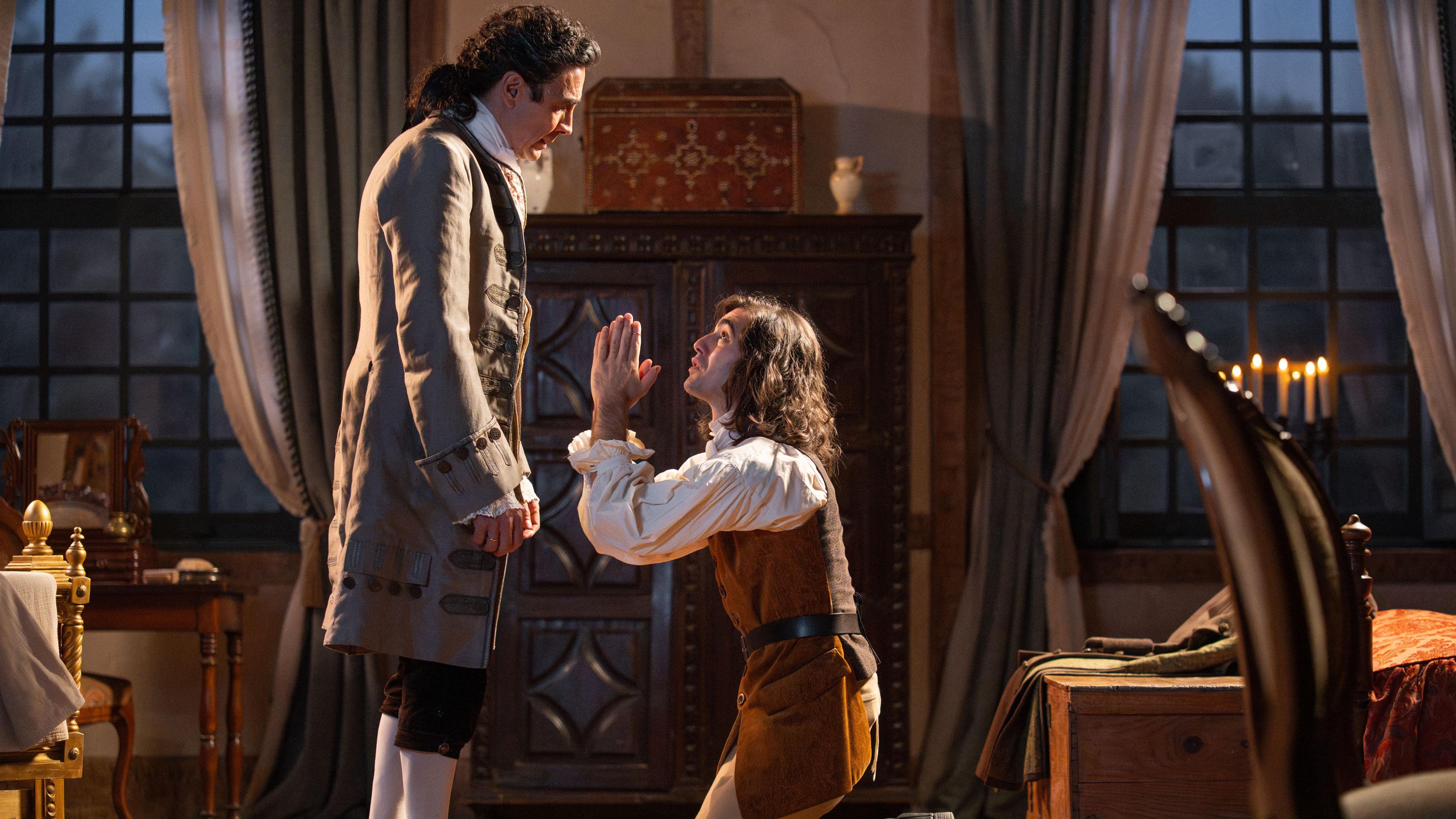 Alejo se arrodilla frente al duque para pedir perdón y clemencia para Luisa.