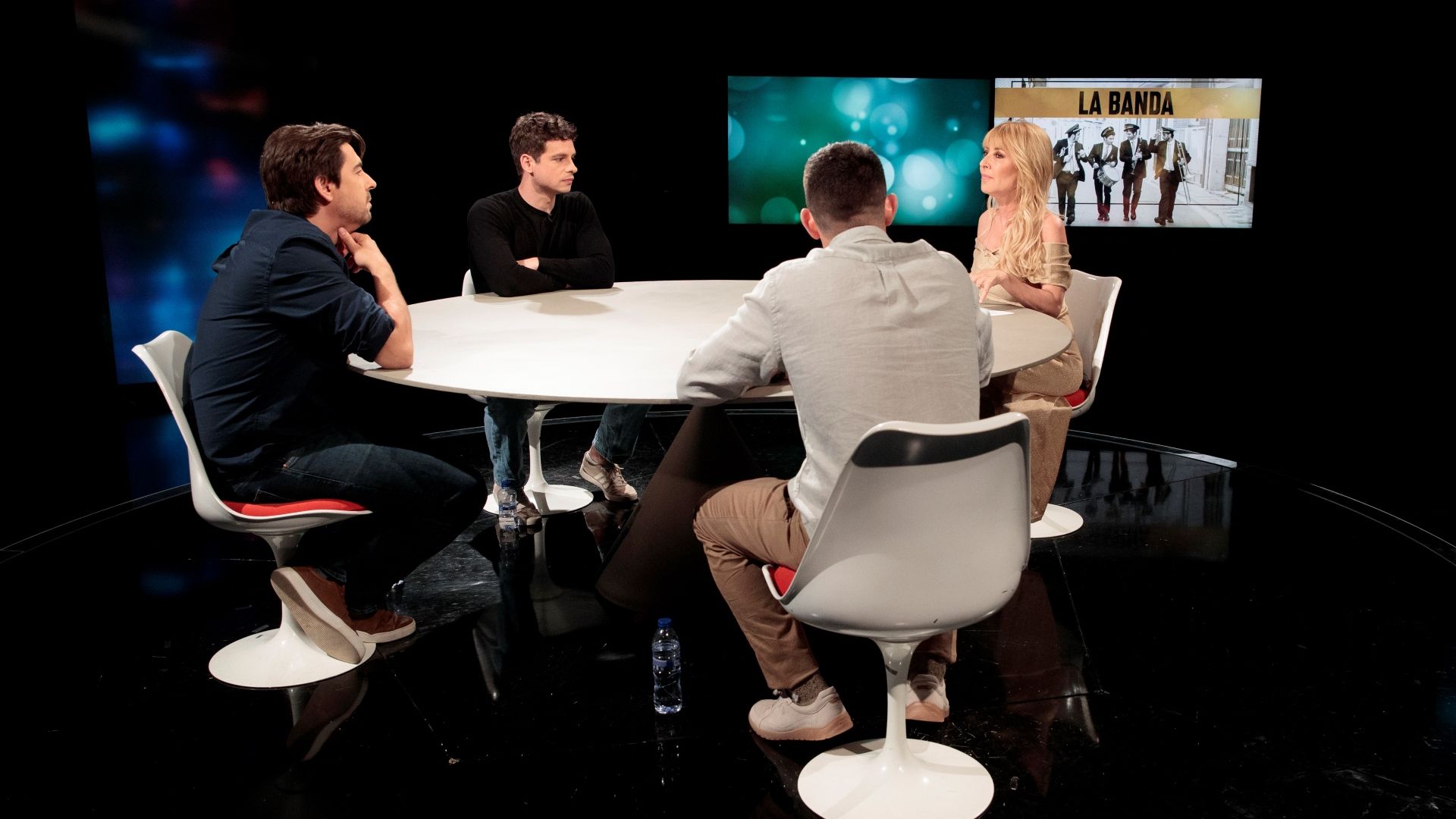 Cayetana Guillén Cuervo está en plató con Roberto Bueso director de 'La banda' y con los protagonistas, Gonzalo Fernández y Xavi Giner.