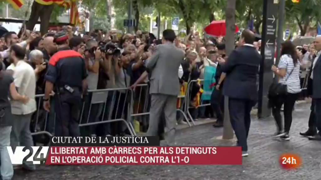 Sortida dels últims detinguts en la operació anti-referèndum d'abans d'ahir. Avui han passat a disposició judicial i han quedat en llibertat amb càrrecs. El jutge els acusa de desobediència, prevaricació i malversació...però descarta el delicte de sedició. Els alts càrrecs del Govern, entre ells LLuis Salvadó i Josep Maria Jové han estat rebuts per centenars de persones concentrades davant la ciutat de la justicia.