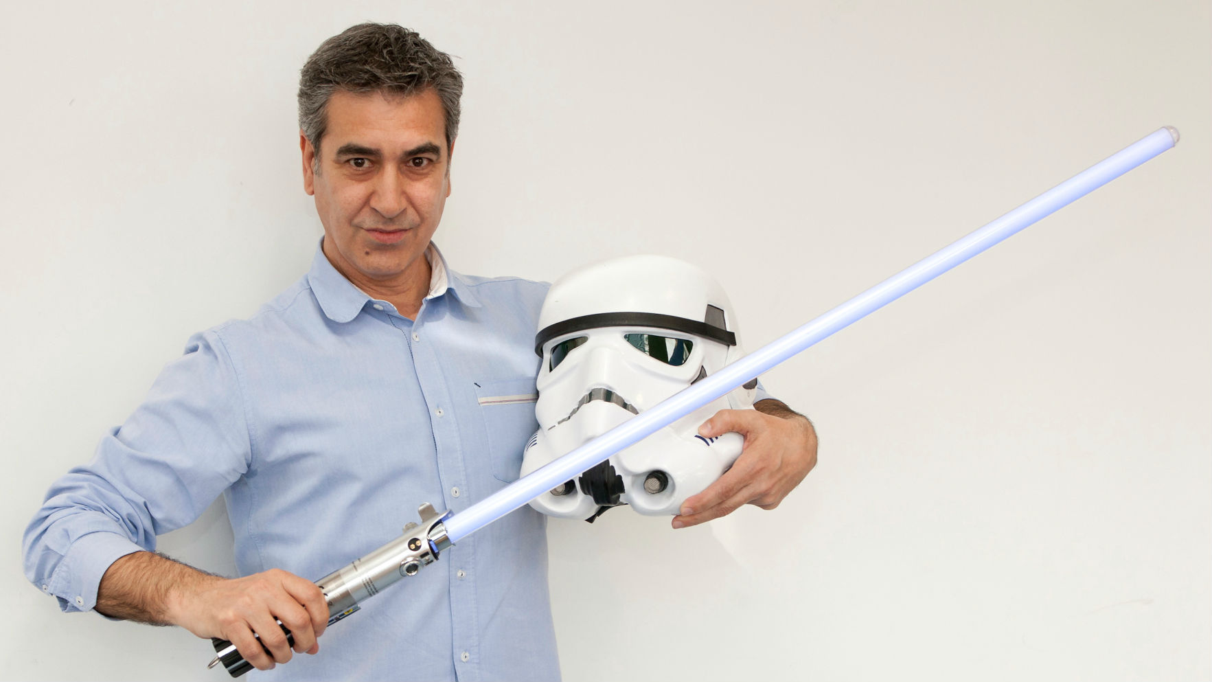 Arturo Martín, en los estudios de Rne Madrid, con algunos objetos relacionados con Star Wars rne