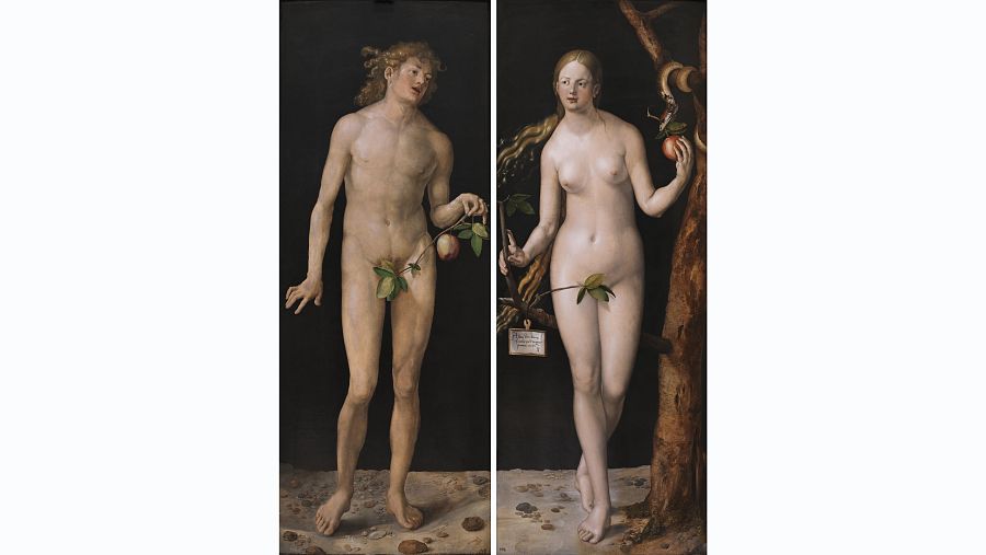 Dotar a la madera de la suavidad de la piel humana al pintar sobre ella es algo que no está al alcance de cualquier artista. Exige un tratamiento delicado y un profundo conocimiento de la anatomía como el que tenía el alemán Alberto Durero. Nacido en 1471, hijo de un orfebre húngaro emigrado en Núremberg. Grabador prodigioso desde muy joven, Durero antepuso su vocación a su vida personal. Dos meses después de su boda viajó a Venecia, un trayecto que aprovechó para pintar unas magníficas acuarelas al atravesar los Alpes. Allí conoció a Bellini. De vuelta en Núremberg abrió su propio taller y diez años más tarde, en 1505 visitó Italia de nuevo, ya como un artista famoso, como un señor, decía él en sus cartas. Ese influjo italiano es evidente dos obras que pintó nada más volver de ese segundo viaje a Venecia: Adán y Eva.